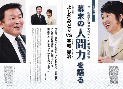 今月の「道」は、私が尊敬する吉田松陰についての対談でしたのでより感銘をいただきました。江戸300年の侍文化の生んだ結晶と言うべき人物・私を滅して公に奉じる者こそ侍であるとされ、目標としなければいけない事ながら、建前とされがちであった事を正に本音と合致させた人物。維新の原点・日本を変革させた人物だったと思います。 その人生は行動につぐ行動。が失敗につぐ失敗。しかし前をのみ向きつき進んだものでした。周りから見れば、宇城先生の言われる胸からライトをさらに身体から照らしていた人物だったと思います。この対談のなかで吉田松陰の言葉で、道は即ち高し・・・の一節がありましたが、学ぶ者として感銘をうけました。 又、「被災地の今」と「気づく、気づかせる」では子供達の持つ桁違いな愛や「自分たちはもっともっと勉強して人を助けられる人間になりたい、自分の街は自分たちの手で」とこんな事まで考えているのか、と驚きでした。 宇城先生が言われる、生まれながらの心が自立・自力の心を持っている事を教えていただきました。 (Y,F三重実践塾生、証券会社勤務)